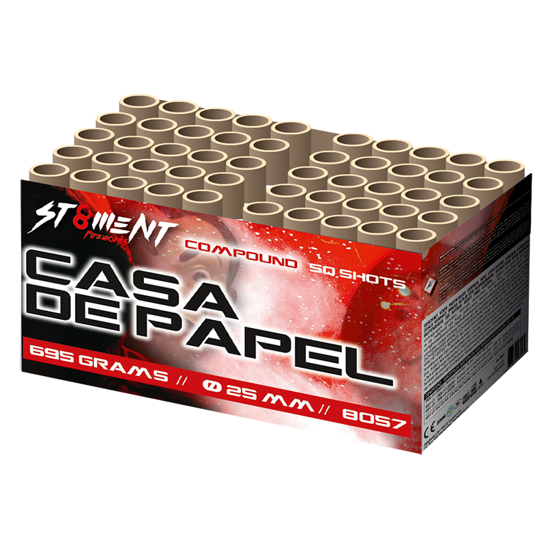 De Casa de Papel gaat voor de grote schat! Deze 50 schots compound schiet prachtige blauwe mines met groene staarten welke ontpoppen in dikke Ti-gouden palmen, gevolgd door dikke knetterpalmen met rode, groene en witte glitters! n nProductinformatie: nType product: Siervuurwerk nEffect product: Compound nTube diameter: 25mm. nFanshape: Nee nClassificatie: CAT.F2 nMinimale leeftijd: 16 jaar nLegaal afsteken op: 31 december nVeiligheidsafstand: minimaal 8 meter nGeschikt voor smalle straten: Ja nGeschikt in Gemeente vuurwerkverbod: Nee Casa de Papel 50 shots 25mm Goedkoop vuurwerk kopen bij Vuurwerkwinkel Arnhem