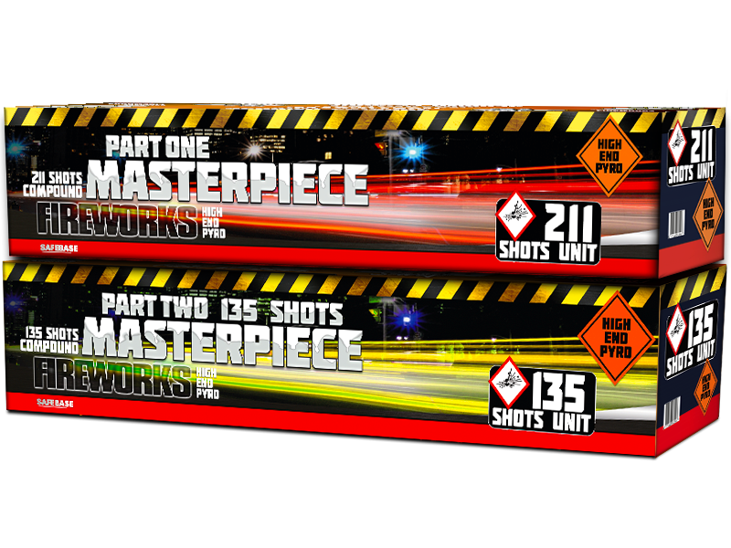 Masterpiece nEen meesterwerk van 2 compounds die samen 1 mega show weggeven van 3 minuten. De lucht wordt gevuld met spinning tails en kleurrijke boeketten. Het einde wordt afgesloten met een super finale. n nKruitgewicht 3488 Gram nTube diameter 25 / 30 nBrandtijd 190 Seconden nHoogte 30 m. – 35 m. n