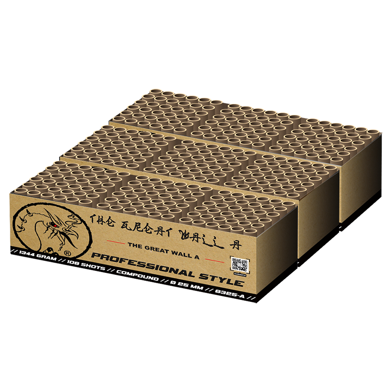 324 shots 25mm compoundset van Professional Style. The Great Wall is de internationale naam van de Chinese muur. En die is groot, net zoals deze super compoundset. Met drie compounds van ieder 108 schoten zet u een waar spektakel neer. Alleen de allermooiste effecten, in Professional Style, schieten in rap tempo, afgewisseld in salvos met een enorme passie de hemel in, nog niet te spreken over de rammende finale welke u buren fluitend buitenspel zet. Steek deze set volgens de afsteekvolgorde A, B, C aan, en uw show is fantastisch!